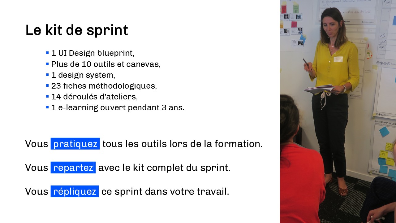 Cet apprentissage inclut des fondamentaux de la facilitation de sprint. Il intègre des ateliers et points d'étapes clé en main pour vos projets. Vous les répliquez en les adaptant à votre projet.